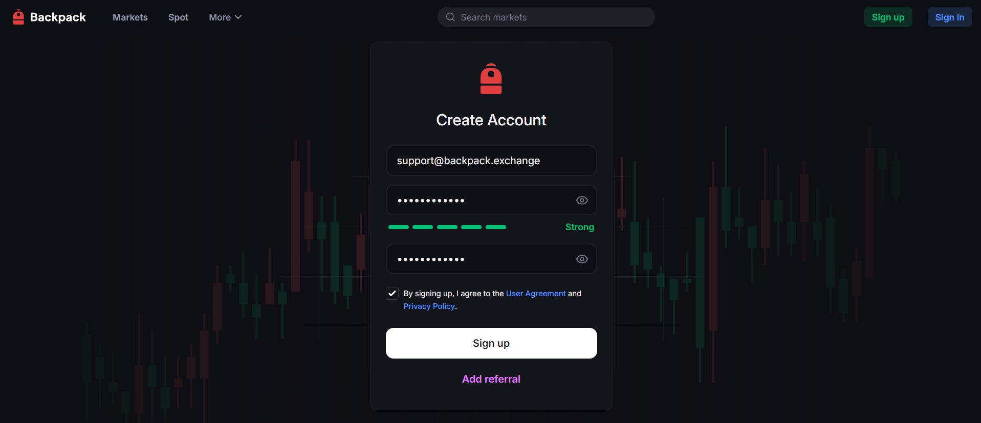 You'll need to register first before you can start trading on Backpack EU. Setting up your account on Backpack EU is simple and straightforward.